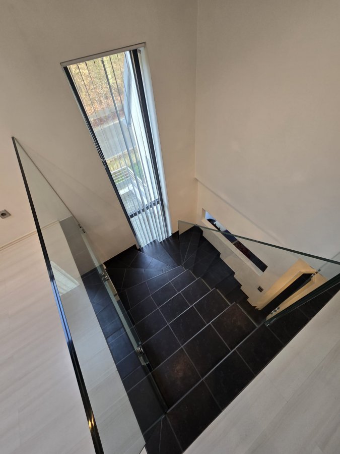 L'escalier menant au 2e niveau du duplex est vitré, donnant une luminosité exceptionnelle au bien. Au 2e niveau se trouvent une très grande chambre à coucher et une salle de bains moderne, ainsi qu'un hall permettant d'aménager un espace bureau.