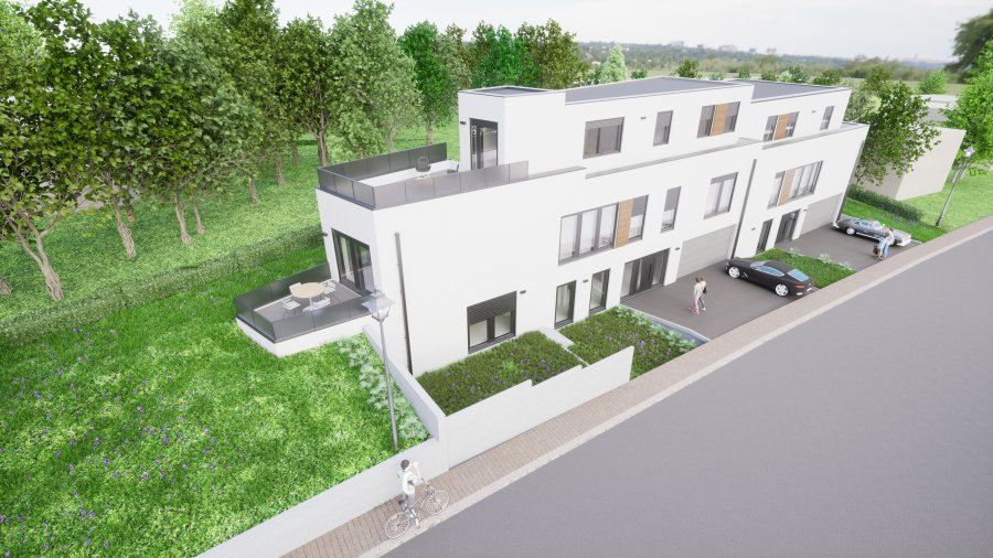 Senningerberg, dans une nouvelle maison bifamiliale à vendre: duplex situé au 1er et 2e étage, avec 2 grandes chambres à coucher (18 et 17 m2) et un grand bureau (15m2), 2 salles de bains avec une surface nette habitable de +/-125 m2 + les terrasses 25 m2:- rdc: hall d'entrée privatif, garage pour 1 voiture, parking extérieur 1 voiture